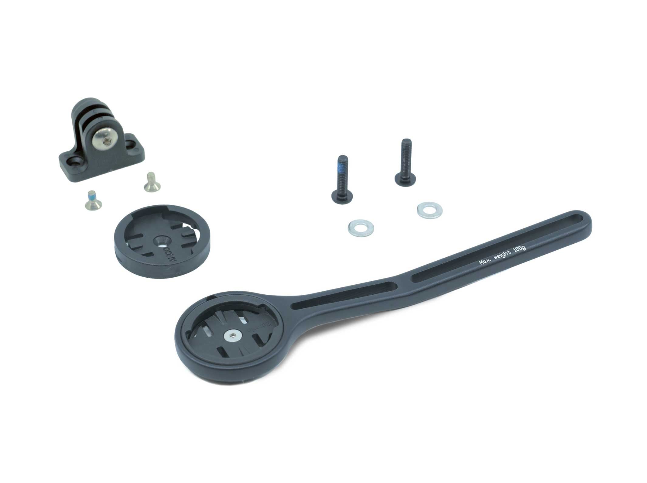 1x alloy computer mount; 2x M4x16 bolts; 2x washers; 1x adaptor Garmin; 1x adaptor Wahoo; 1x GroPro mount