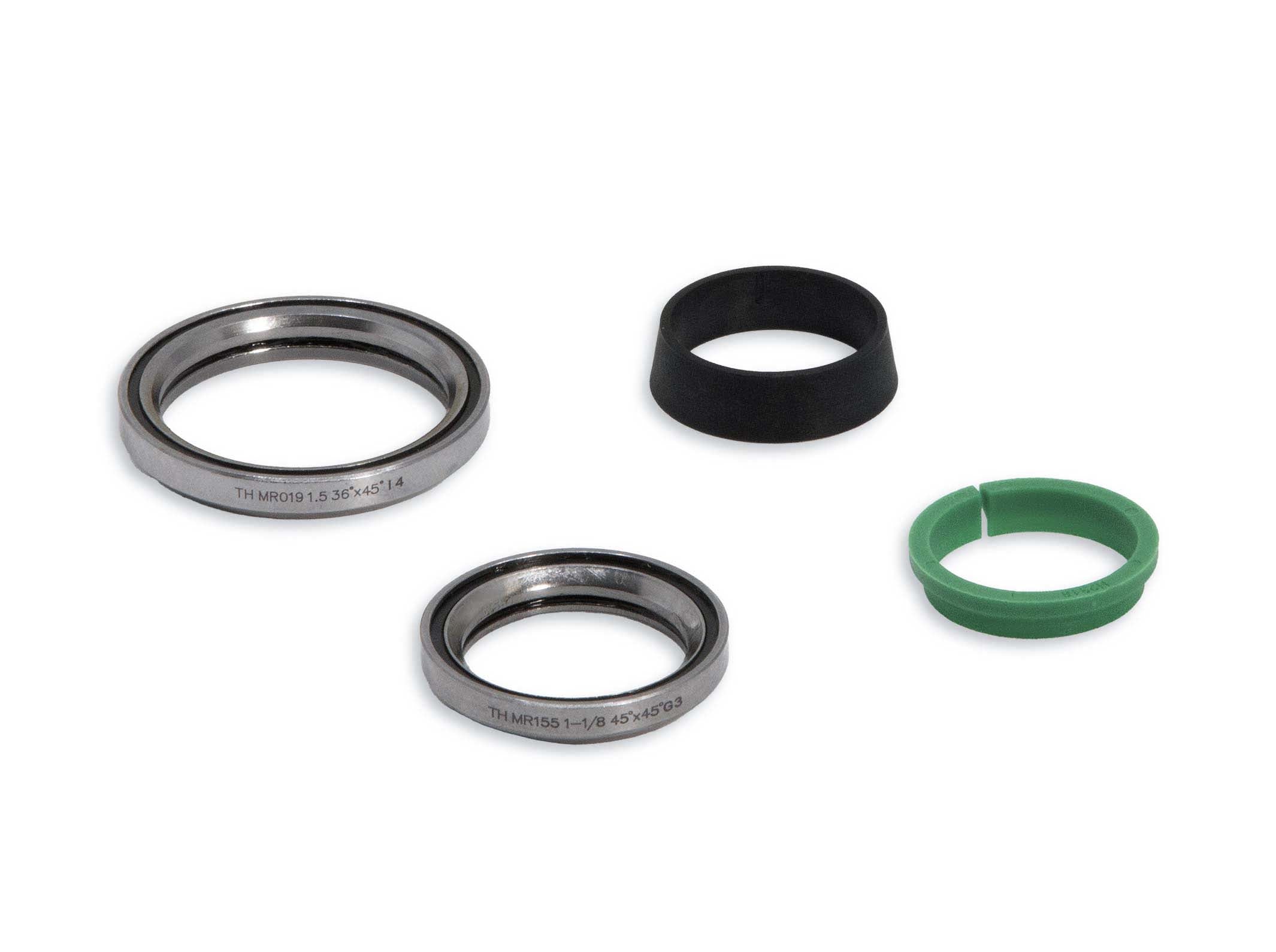 The HS-B-25-P BMC replacement headset kit includes FSA stainless steel bearings, a compression split ring, and a conical spacer |This kit contains: H2430 (conical spacer 10mm) | H2318 nylon compression split ring | MR042S stainless, upper bearing | MR110S stainless lower bearing